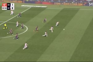 比赛第83分钟,巴列卡诺反越位战术打成,埃斯皮诺得球,此时巴列卡诺4人直面巴萨门将霍安·加西亚,但最终埃斯皮诺的射门打高了。