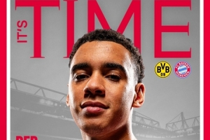 拜仁本次发布的海报设计独具匠心,采用了知名杂志《TIME》的封面风格。拜仁前锋穆西亚拉身着球队红白战袍占据封面,海报上方印有醒目的红色大字“IT'S TIME”,下方则用德语标注"经典对决”,并配上了主帅孔帕尼的评价:“这是一场顶级较量”。