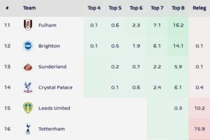 Football Meets Data给出了最新的各队降级概率,热刺降级概率已经升至16%。若下一轮热刺不敌利物浦,那么降级概率将至少来到19%。